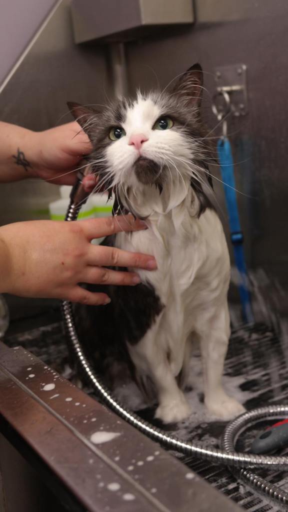 “If a cat is to flail (lose control), DO NOT put your hands in front of it, if you cannot stop before they go crazy, let them flail. They will generally flip, let them do so, but controlled in the area you can continue to help them. Keep hands over them to keep control, but not in the face. If needed use a towel. Stop the bath, if shampooed then try and rinse by bucket or any means necessary, but do not continue bathing. You will get bitten. In this case, they would have to go home wet as it would be too dangerous for you and the cat to continue.